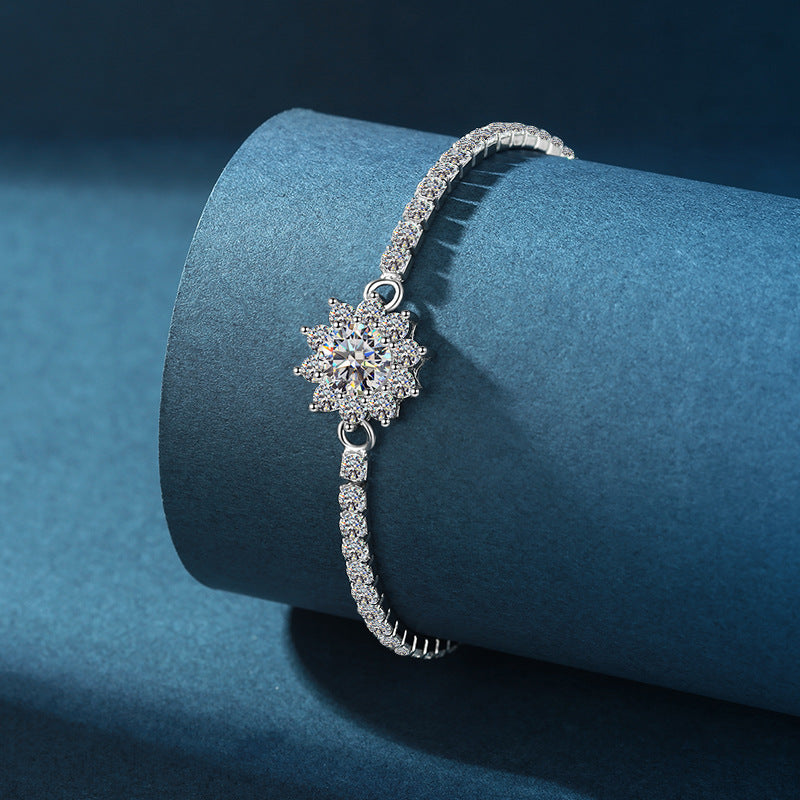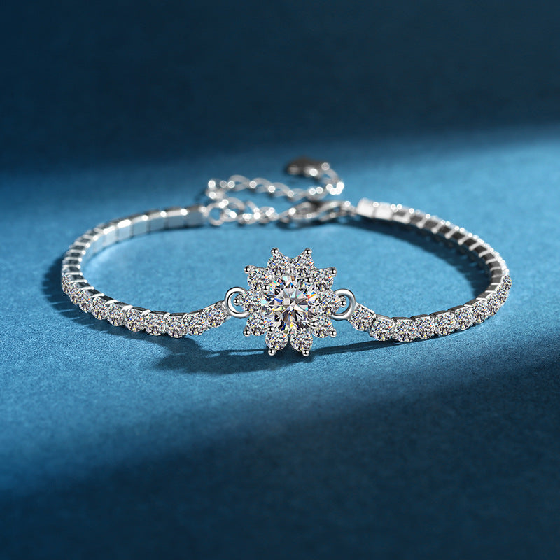 A masterful blend of artistry and shimmer, our Sunflower Diamond Bracelet in Moissanite is adorned with additional stones that extend across the sterling silver band. The result is a luminous, sophisticated piece that captures light, attention, and admiration with every movement.